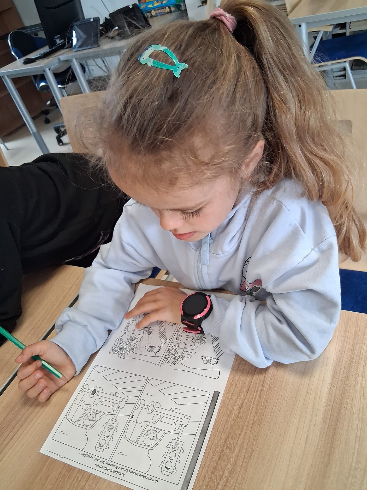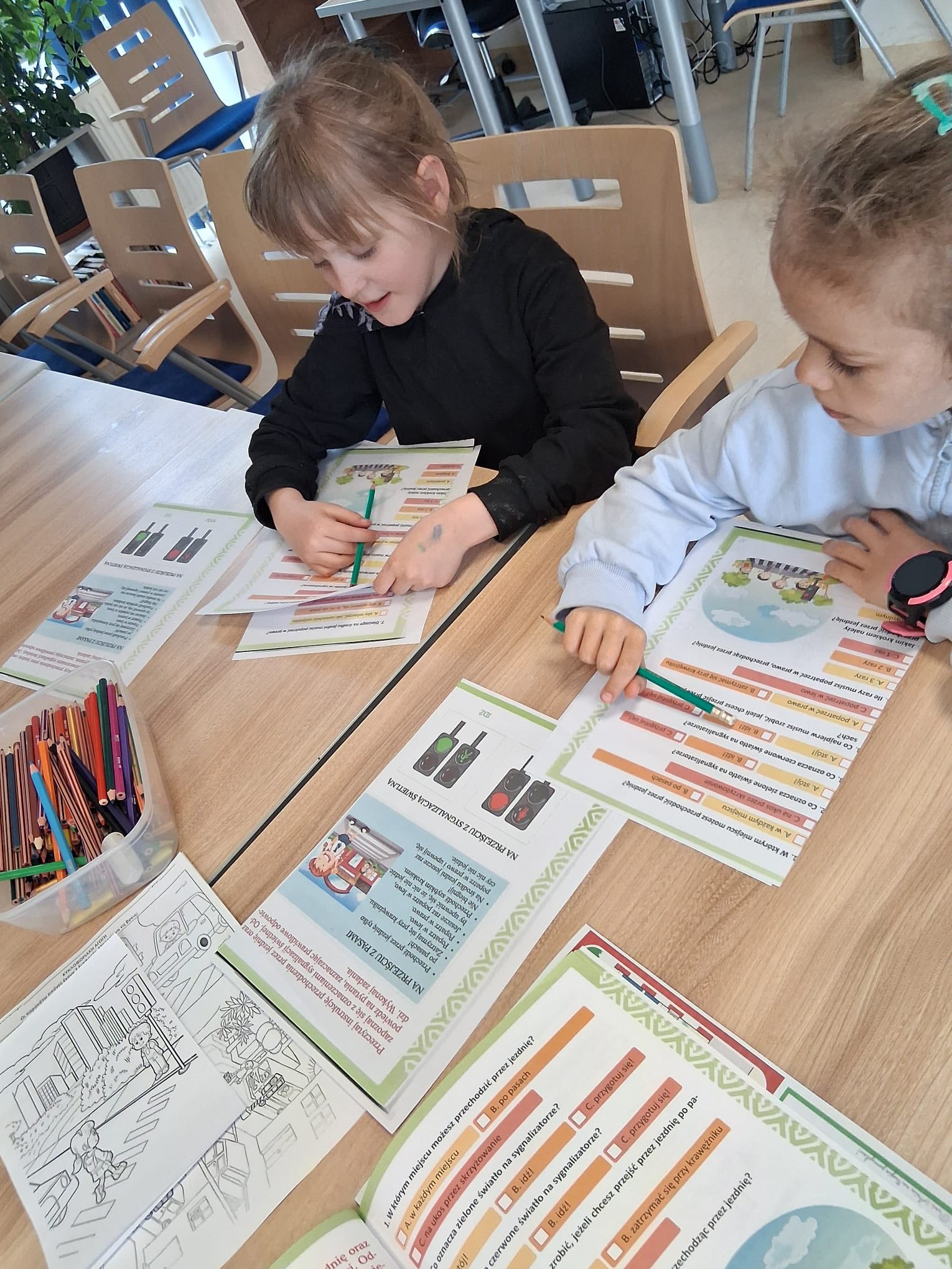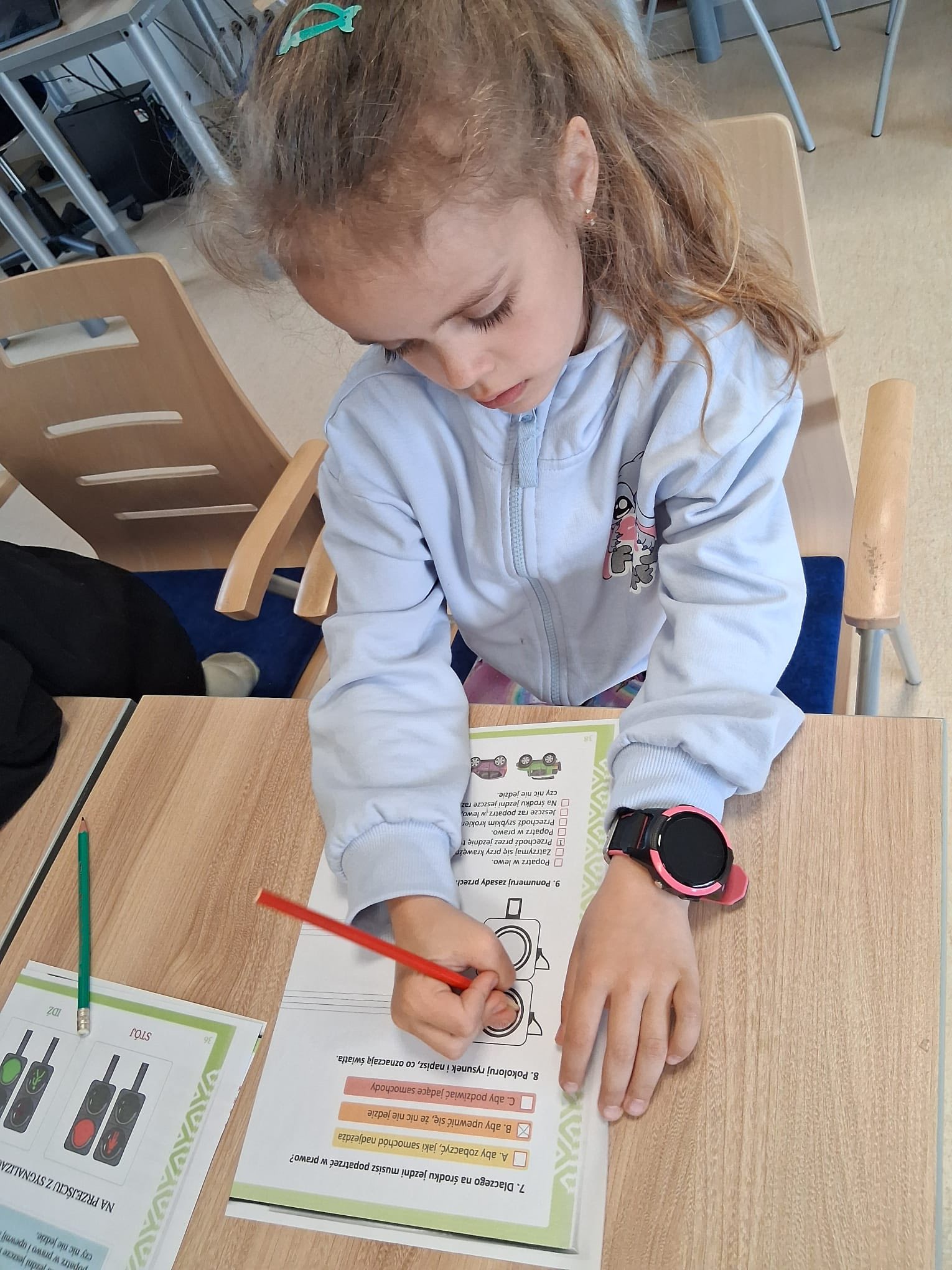 Tym razem pracowaliśmy z instrukcją bezpiecznego przechodzenia przez jezdnię oraz poznawaliśmy oznaczenia sygnalizacji świetlnej. Po uważnym przeczytaniu tekstu dzieci odpowiadały na pytania, zaznaczając prawidłowe odpowiedzi – ćwiczyły przy tym rozumienie, kojarzenie faktów i wyszukiwanie najważniejszych informacji.